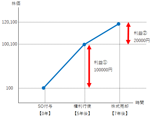 利益は株式売却時点で確定しますが、税務上は権利行使時点でその時点の株価との差額利益①100,000円(100円→100,100円)が発生すると算定されます。