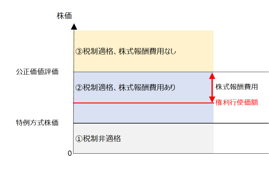 ②の場合の株式報酬費用は公正価値評価と権利行使価額の差額(図の赤矢印)相当となります。